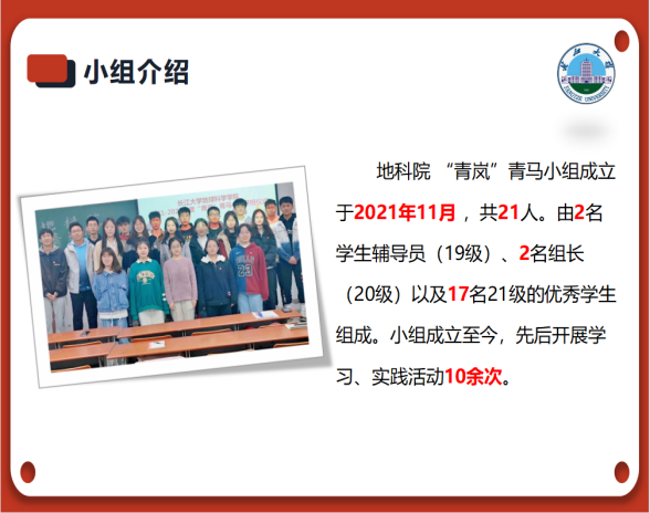 青岚青马小组成立于2021年11月,共21人,由2名班导、2名组长以及17名优秀学生组成。小组成立至今,先后开展了各类活动10余次。