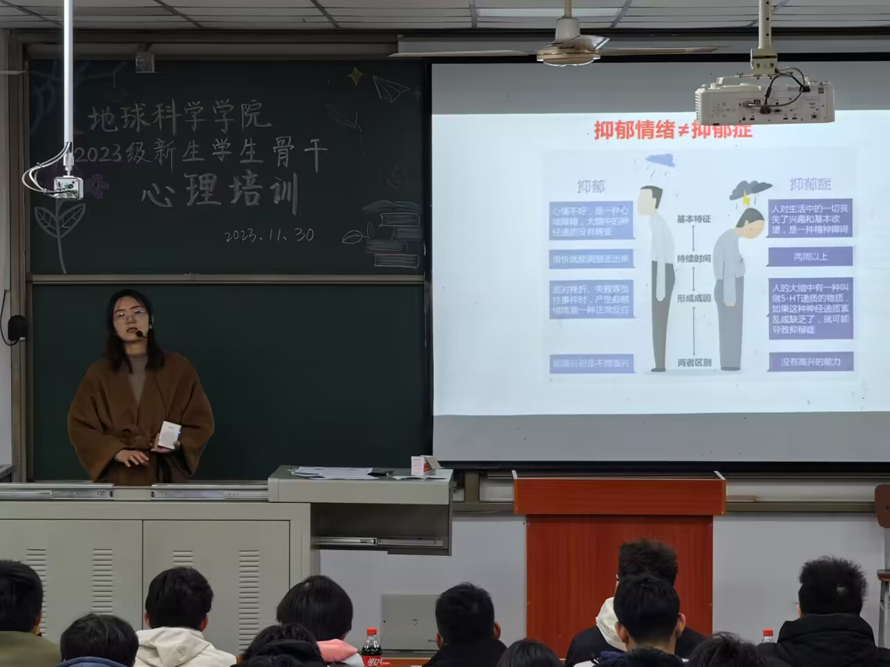 全体23级新生学生骨干齐聚于武教B108,学习“大学生常见心理问题与应对”,心理专干王红桥老师担任主讲。