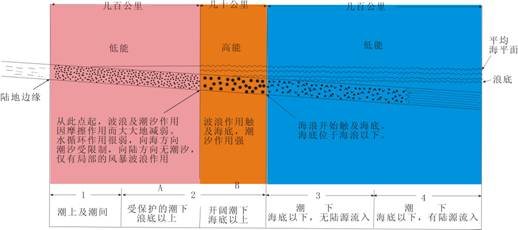 这三个带由于水能量条件不同,所以其沉积物的特征也各不相同。因此这三个能量带实际上就是三个不同的沉积作用带或沉积相带。这三个相带的能量及沉积特征如下。