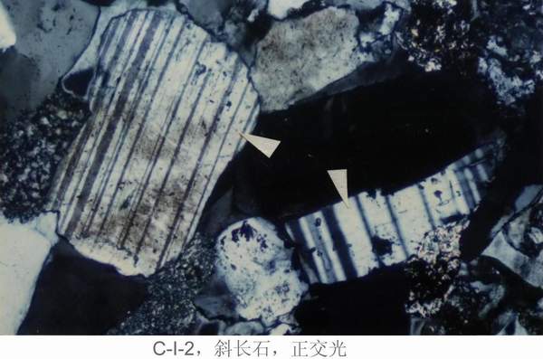 C—I—20:颗粒:石英(多具裂纹)、石英岩岩屑、燧石、粘土岩岩屑、页岩岩屑、粉砂质页岩岩屑、绿泥石片岩岩屑。