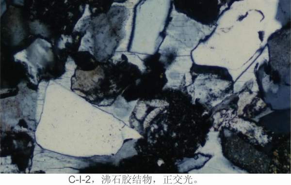 C—I—2:①颗粒:石英、斜长石(绢云母化)、微斜长石、黑云母(绿泥石化)、白云母、绿帘石、石榴石、粘土岩岩屑、火山岩岩屑、黑色金属矿物。②杂基:无。③胶结物成分:以沸石为主,部分可见方解石。④胶结类型:孔隙式胶结。