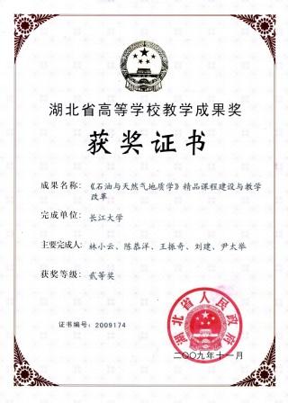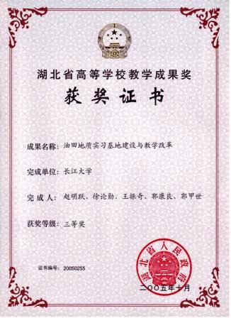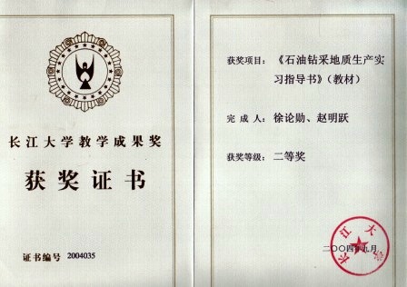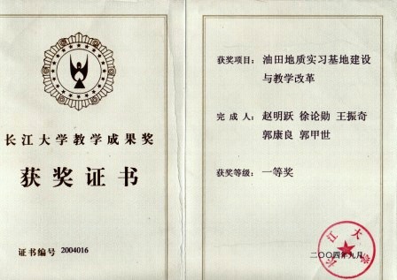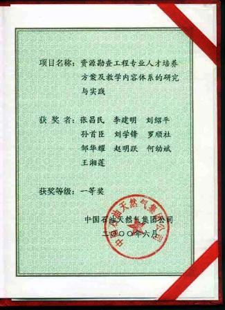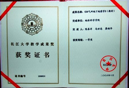 2001年国家教学成果二等奖;2001年度湖北省高校教学成果一等奖;2000年度中国石油天然气集团公司教学成果一等奖;2000年度江汉石油学院教学成果一等奖。 |